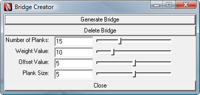 The final step was to create a user interface. Along the development of the script I created variables that allowed me query sliders to attain their values. The interface contains a generate bridge button to initiate the build procedures once the user places two locators into the scene. There is also a delete bridge button that will clear the scene of geometry and curves but will leave behind the locators incase the user wants to continue positioning them.