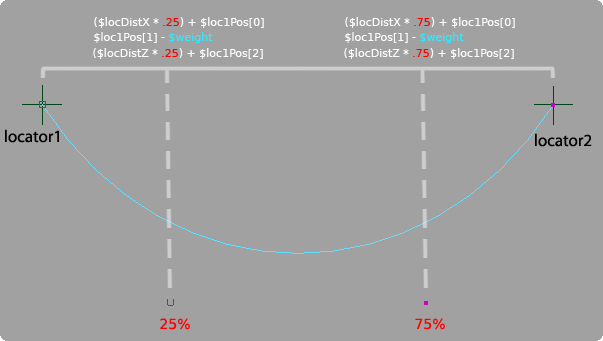solved by subtracting one locator’s position from the other and then multiplying by .25 and .75 to calculate the