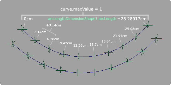 halfway point of the curve would then be U = .5. When the U value is plugged into the arcLengthDimension node it will return the length of the curve in