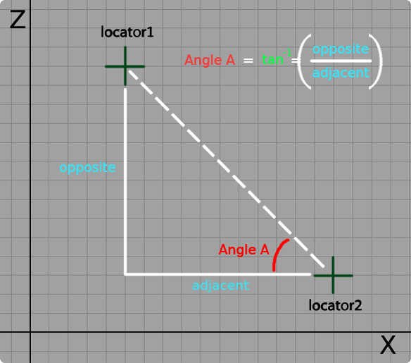 two locators in the scene. By subtracting the X and Z values of the locators from one another I am able to find the length of the opposite and adjacent sides of the triangle with respect to